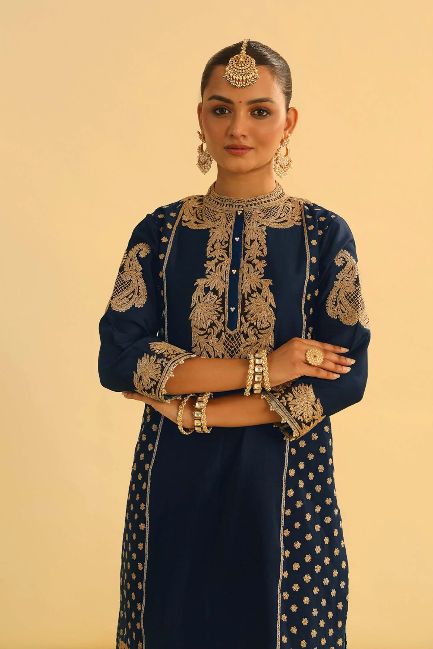 The Aabish ensemble from our Firozah collection is made with a luxe Chanderi Silk fabric, and adorned with heritage Kashmiri Tilla Embroidery. It features a Mandarin collar with a placket and three-quarter sleeves. The look comes with a dhoti. The outfit is finished is using a Chanderi Silk Banarsi fabric and Pearls.