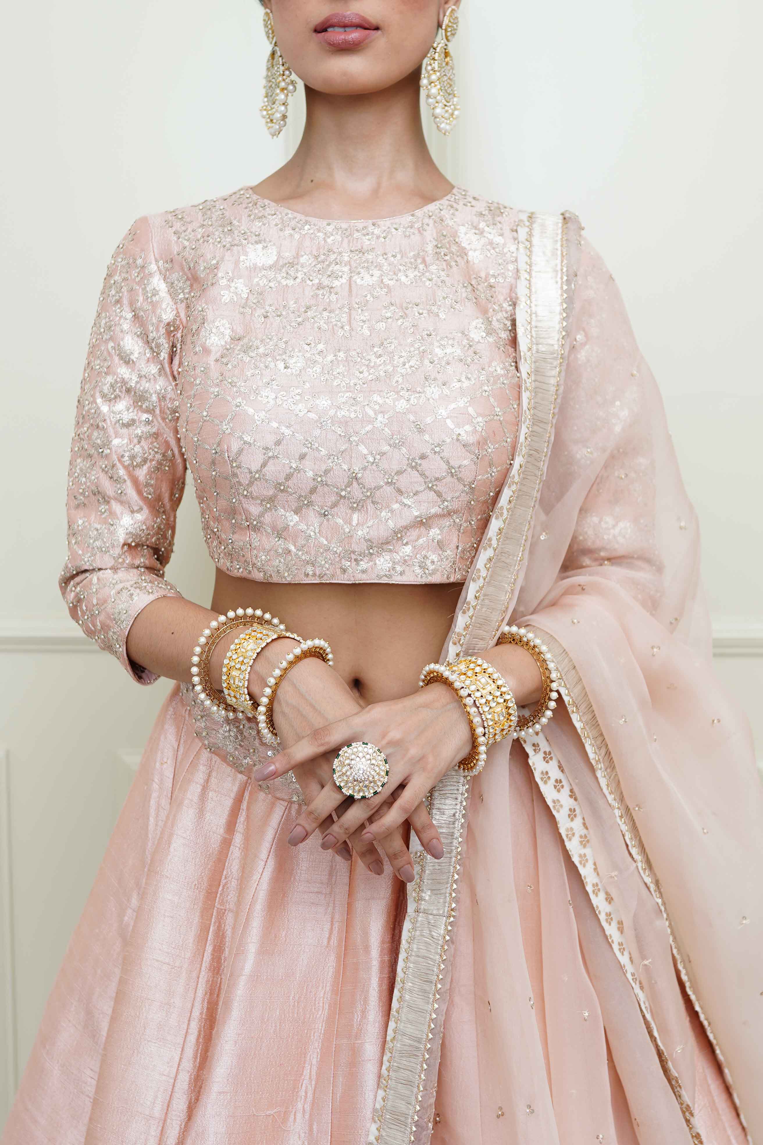 The Aafiyah flowing pearl pink lehenga is made in pure raw silk enhanced with our signature Kashmiri Tilla embroidery. The blouse features a zero neck at front and dories at back with three-quarter sleeves. The embroidery is highlighted with very fine ivory pearls. The outfit is finished using a chanderi silk banarsi fabric and gota.