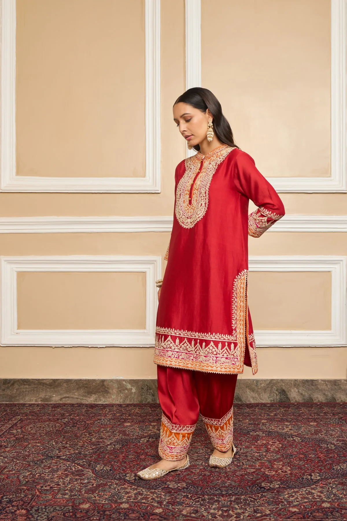 This ensemble is made in pure silk chanderi fabric and adorned with heritage Kashmiri Tilla Embroidery. It features a collar with placket, three-quarter sleeves. The salwar will have an embroidery border at hem. The whole ensemble is highlighted with appliqué, gota and is finished using a chanderi silk banarsi fabric and gota. The dupatta is finished is finished with kinari.