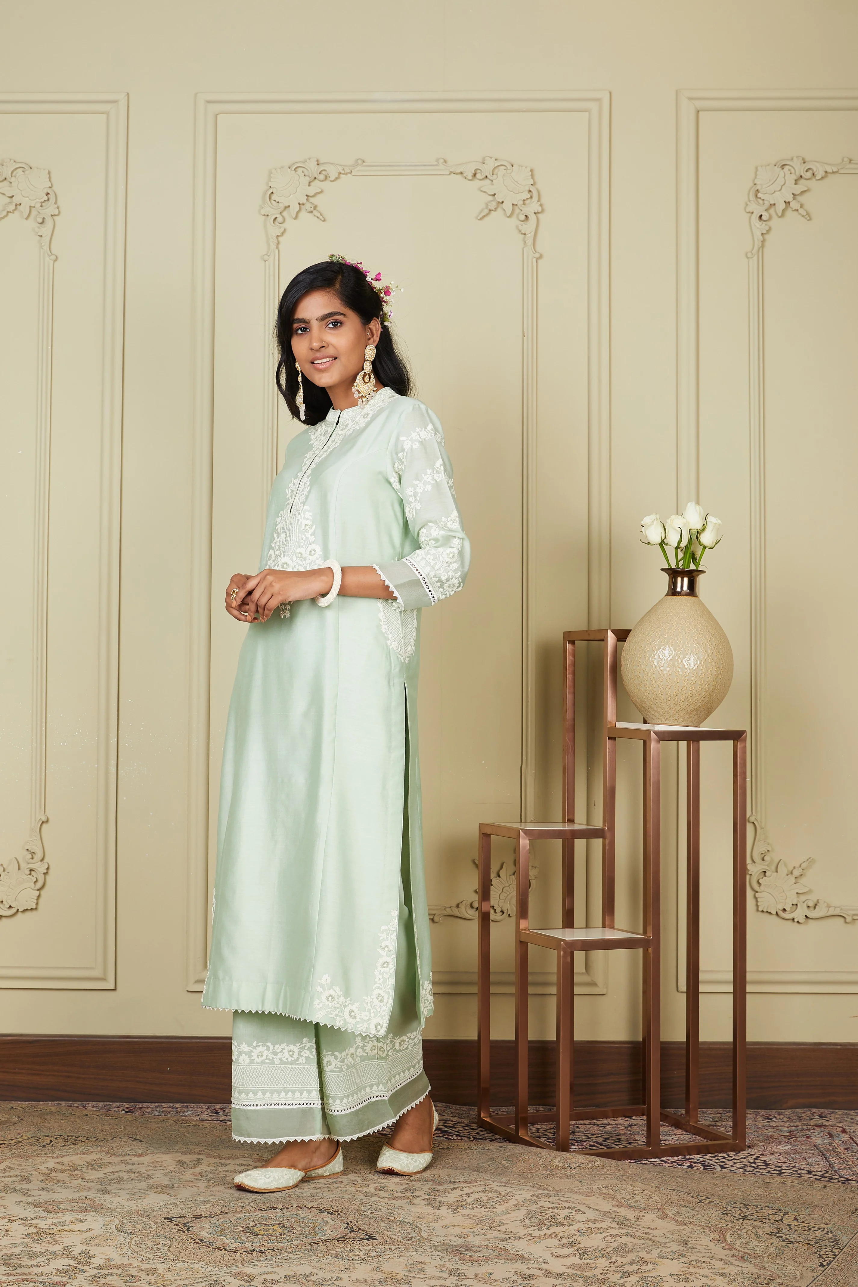 The Banafsha ensemble from our Mogra collection is made using pure Chanderi Silk fabric and adorned with exclusive Dori embroidery. It features a Mandarin collar with a placket and three-quarter sleeves. The ensemble comes with a princess-cut kurta and palazzo, highlighted with tiny pearls and is finished using the trimming of silk organza and lace.