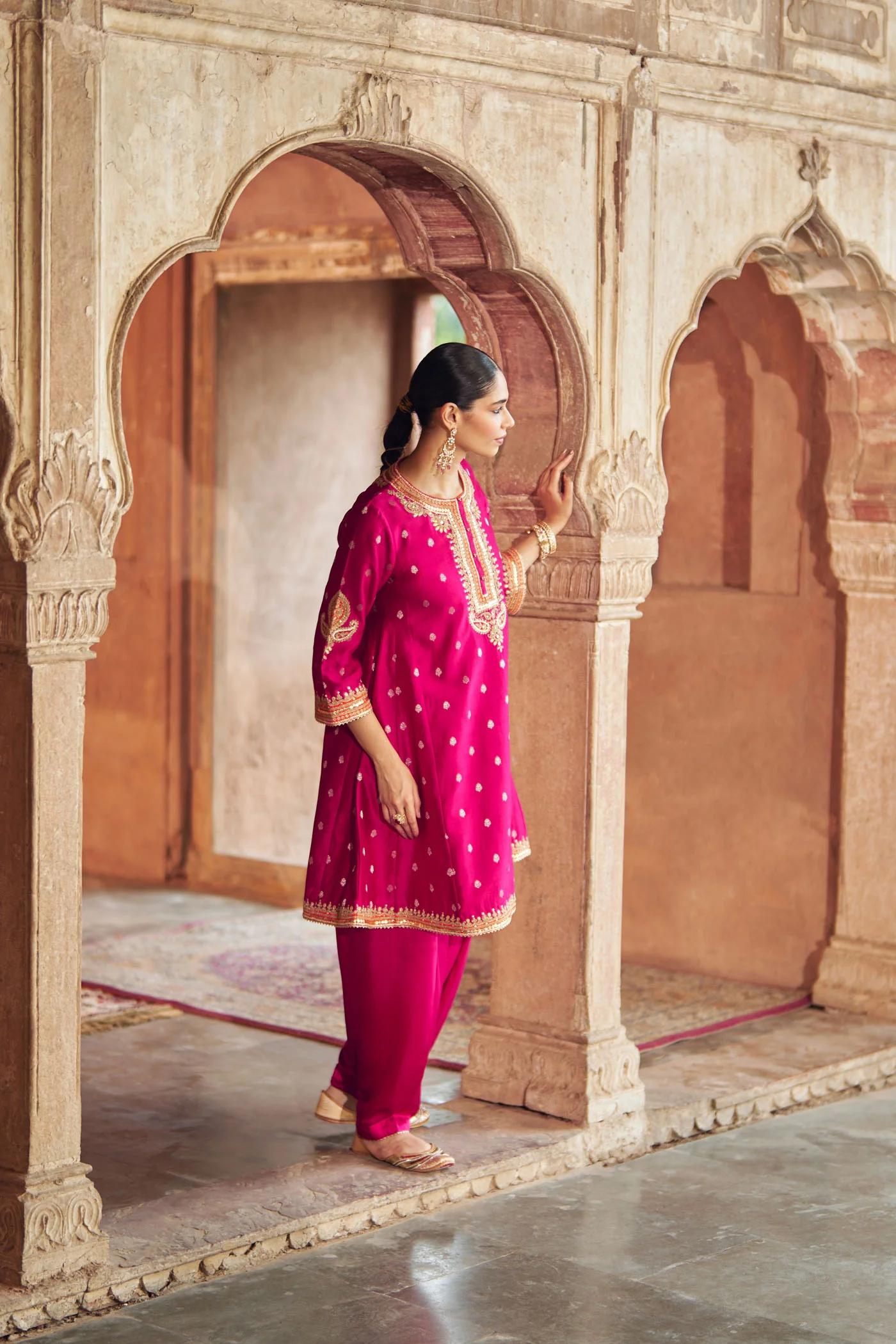 A refined ensemble crafted in pure Silk Chanderi Banarasi, paired with a traditional Dogri salwar. The kurta features a zero neckline with placket and three-quarter bell sleeves. Intricately adorned with Kashmiri Tilla and Gota Patti embroidery, highlighted with pearls and sequins, the outfit is finished with delicate gota detailing for an elegant touch.