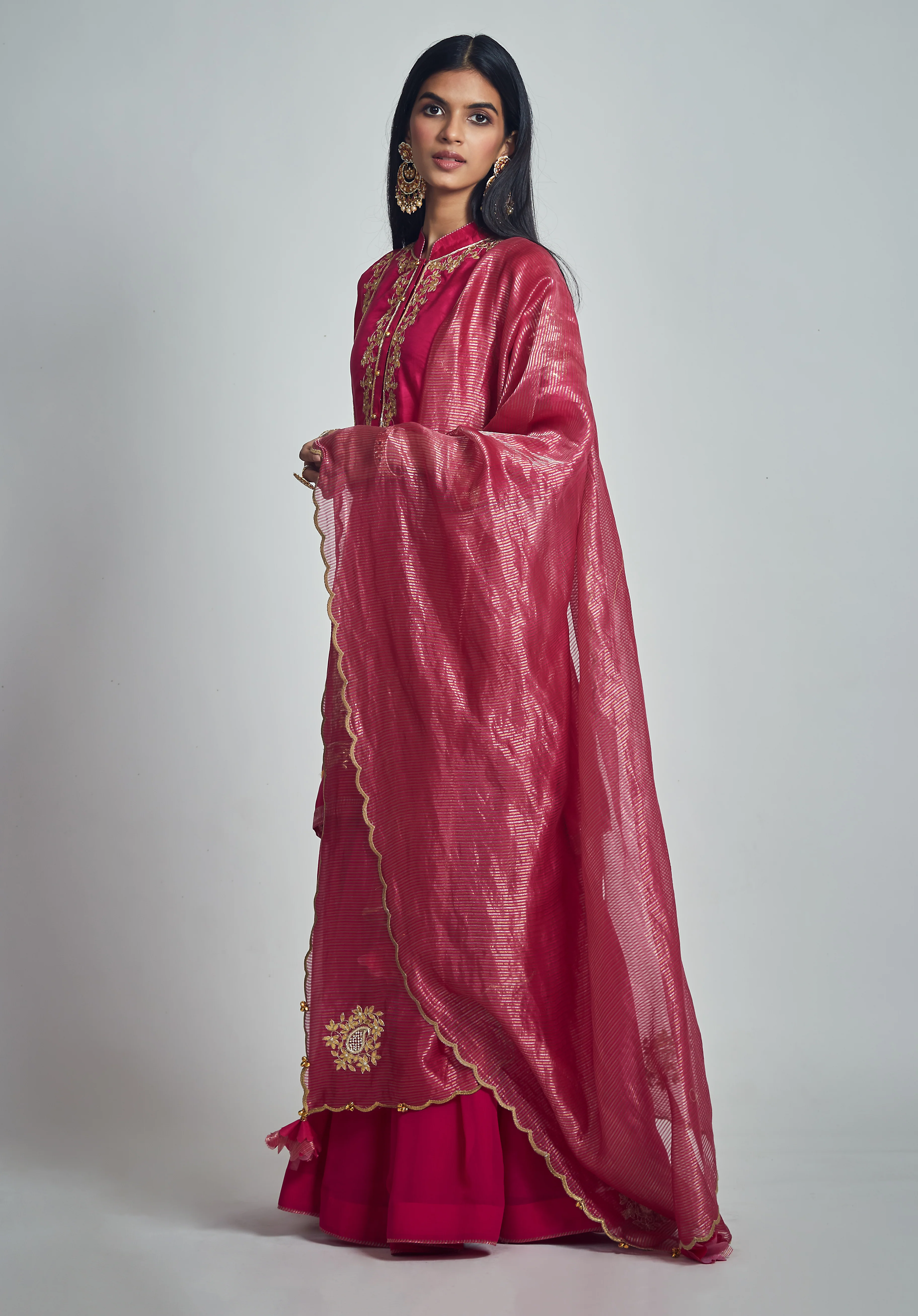 The Nasira ensemble from our Itr collection, made in pure Habutai silk is adorned with heritage gota patti, dabka, kasab and pearl embroidery. It features a mandarin collar with potli button and full sleeves. It comes with a pure georgette and a silk organza tissue dupatta featuring paisley motifs . The finishing of whole outfit is done by silk organza tissue.