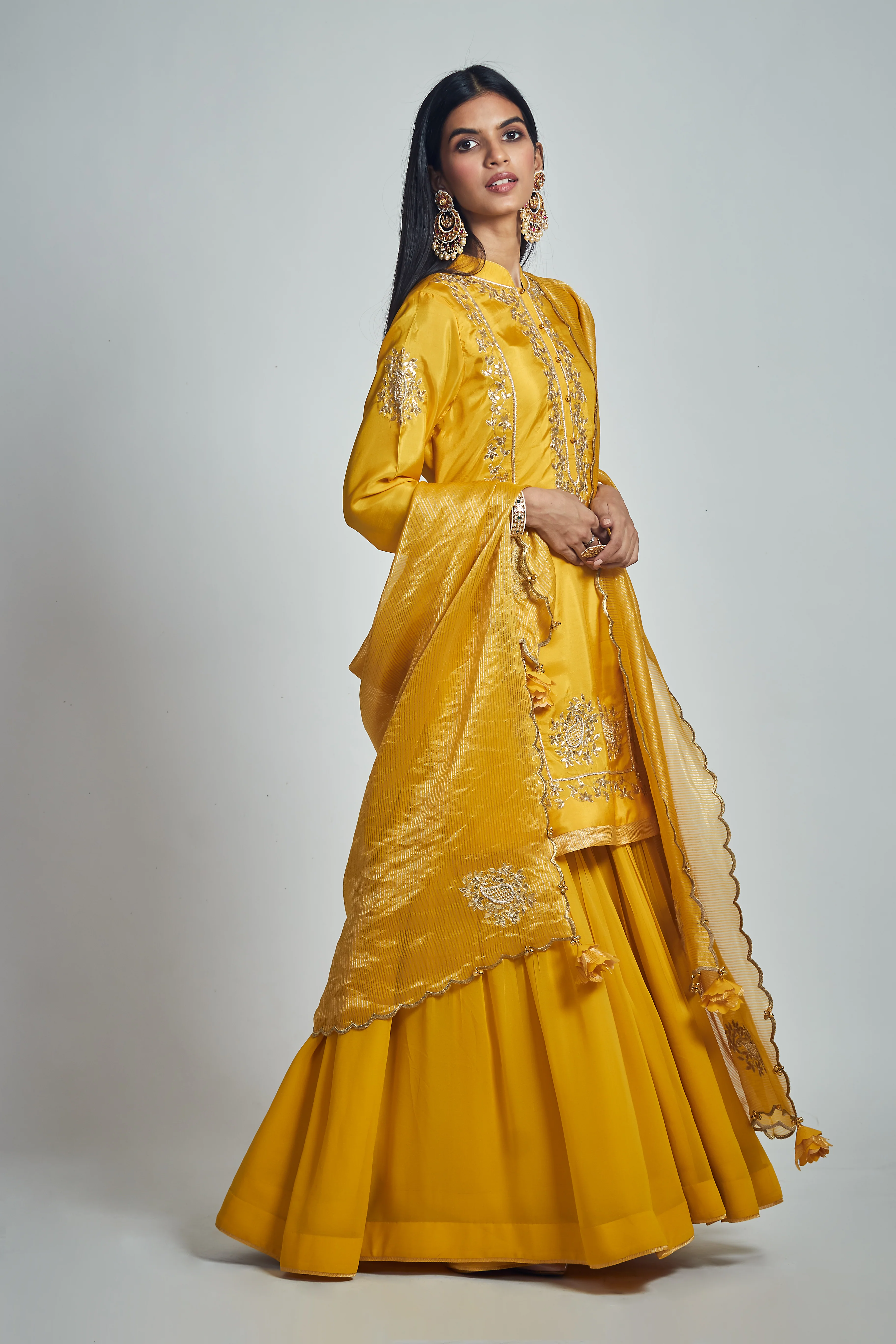 Nasira- Lemon Yellow Habutai silk Gota patti embroidered kurta with garara and dupatta