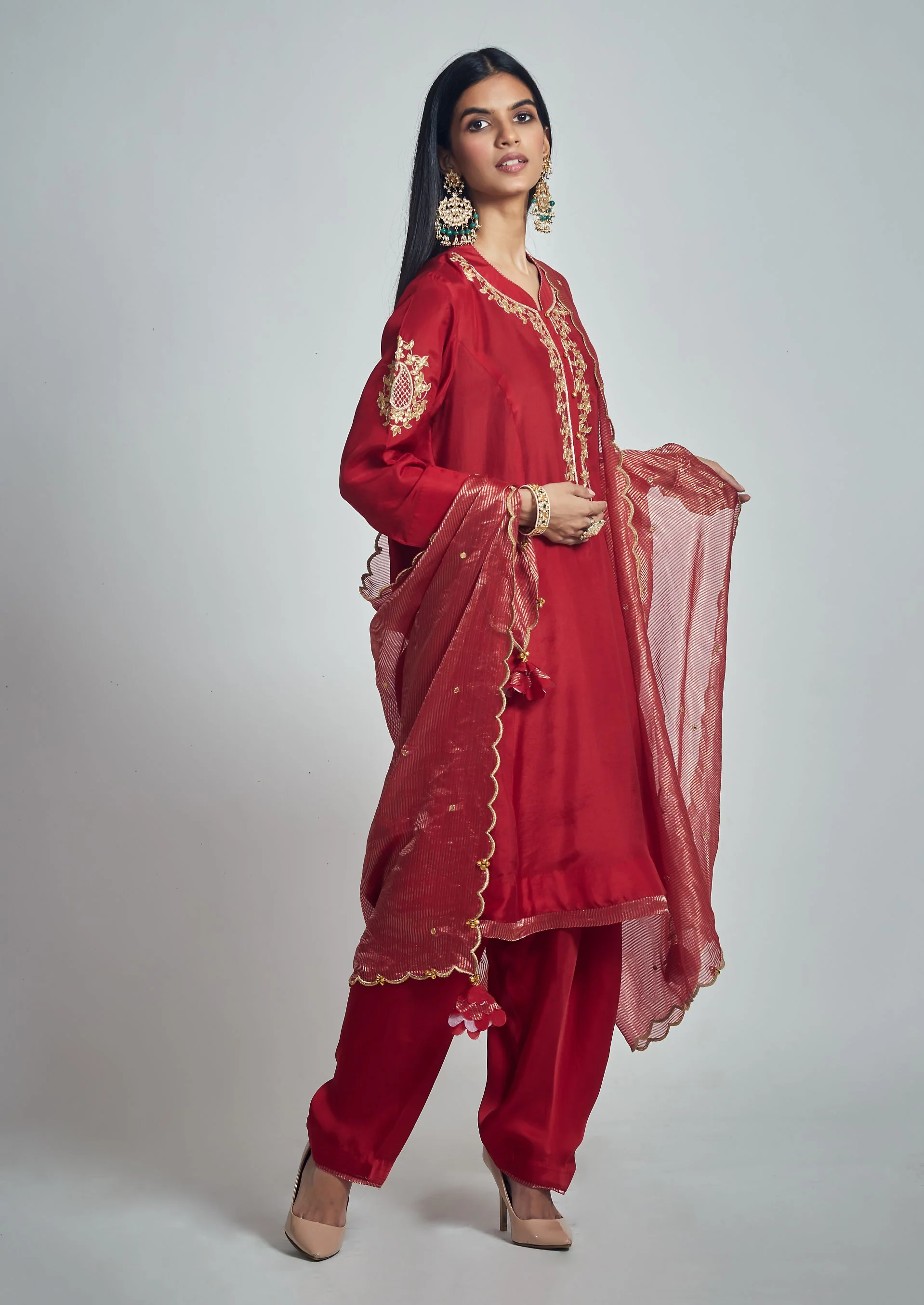 Nazish- Deep red Habutai silk Gota patti embroidered kurta with salwar and dupatta