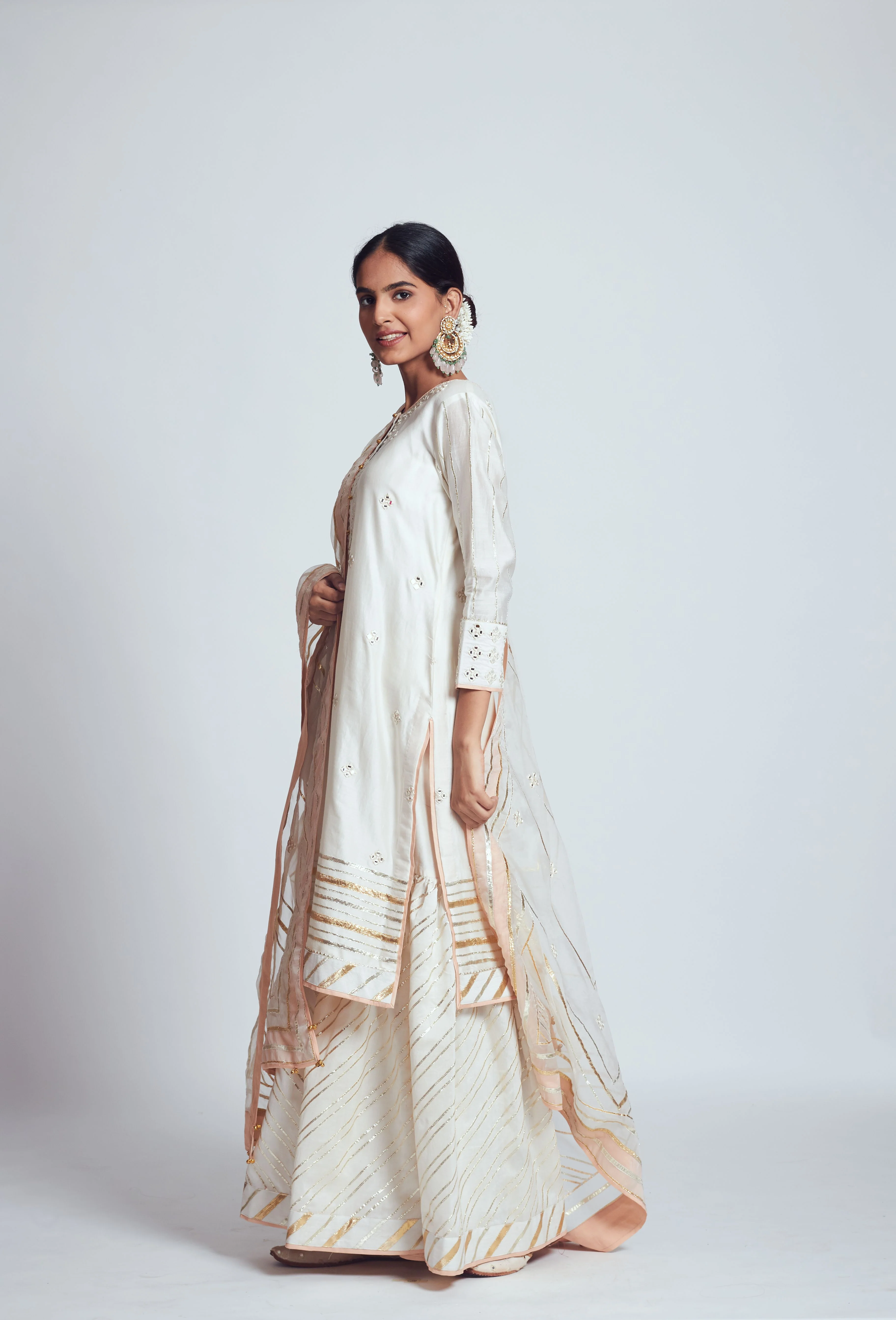 This stunning ensemble from our Falak Collection is made in pure chanderi silk. Featuring very fine gota and mirror work, it has three- quarter sleeves & a cuff adorned with mirror work, and stands to be the perfect outfit for your festivities.
