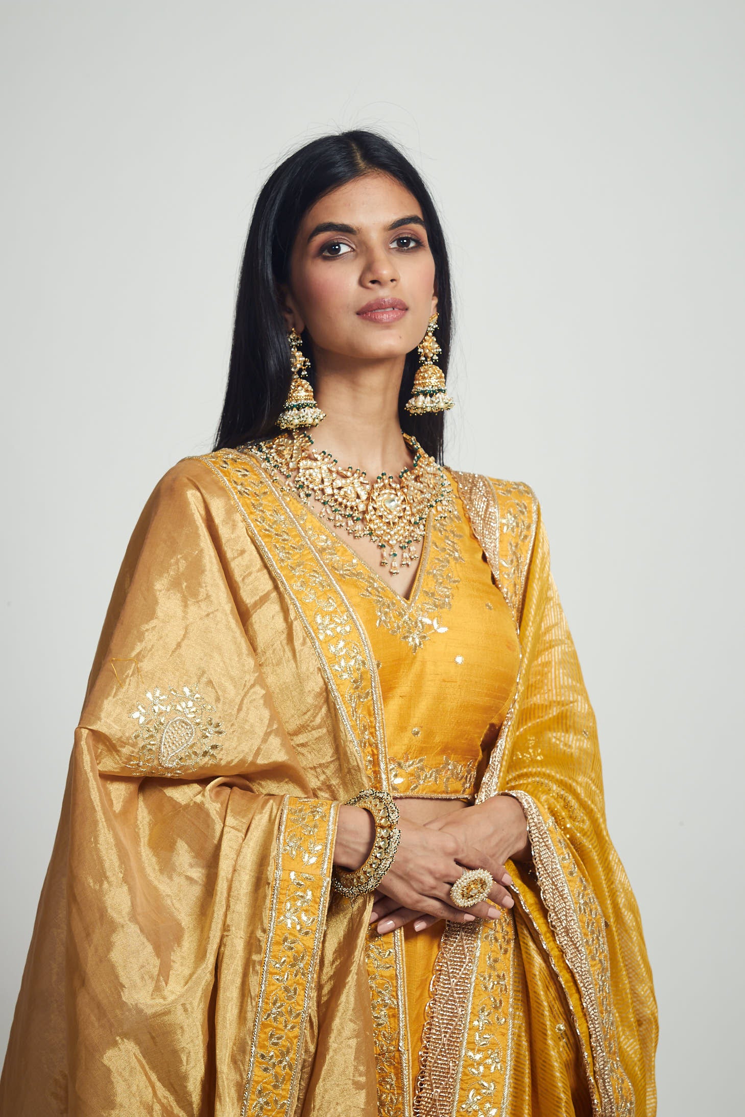 This stunning Odhni is made in pure tissue with embellishment of gota patti, dabka, and pearl embroidery motifs.