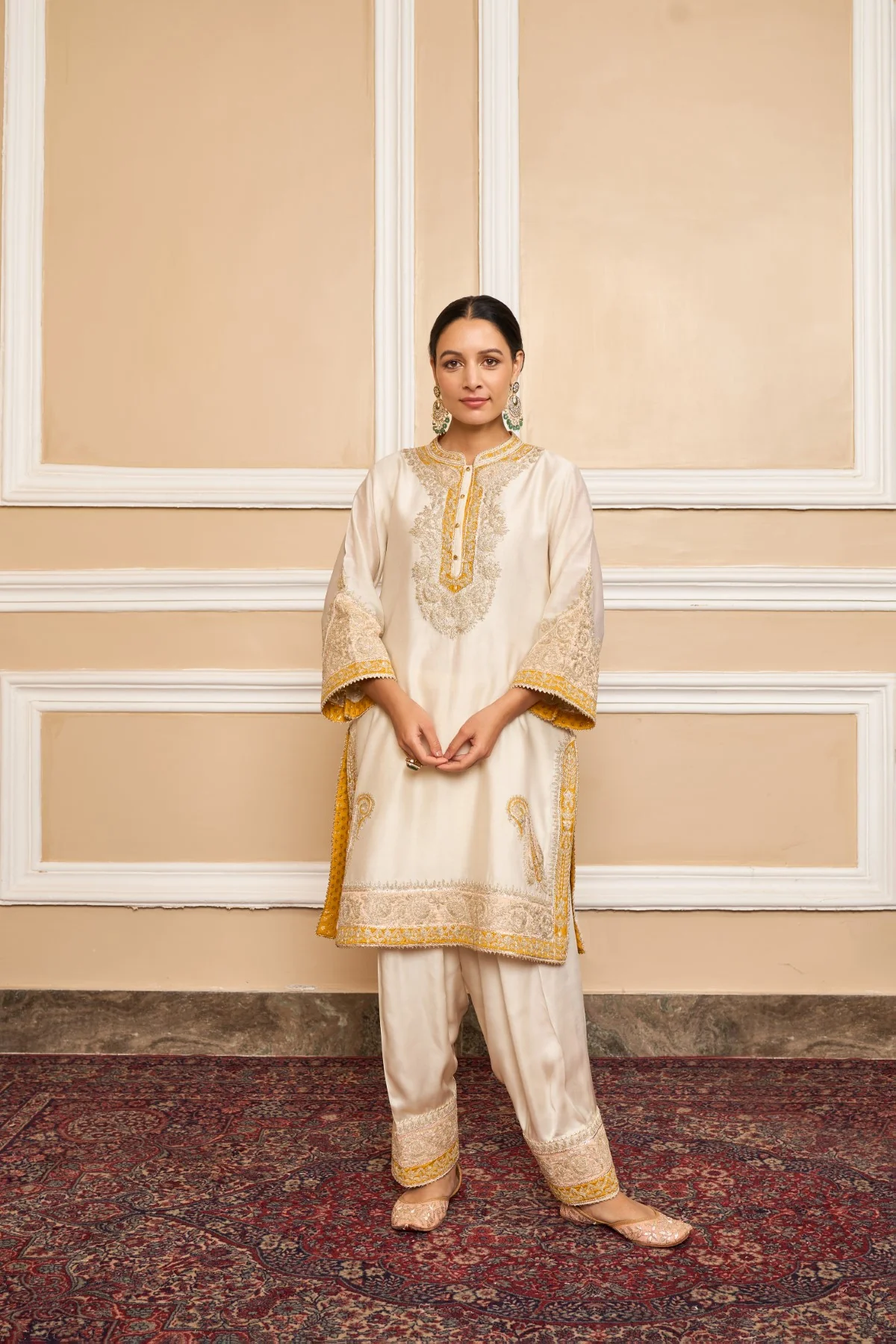 This ensemble is made in pure silk chanderi fabric and adorned with heritage Kashmiri Tilla Embroidery. It features a collar with placket, three-quarter bell sleeves. The salwar will have an embroidery border at hem. The whole ensemble is highlighted with appliqué, gota and is finished using a chanderi silk banarsi fabric and gota. The dupatta is finished is finished with kinari.