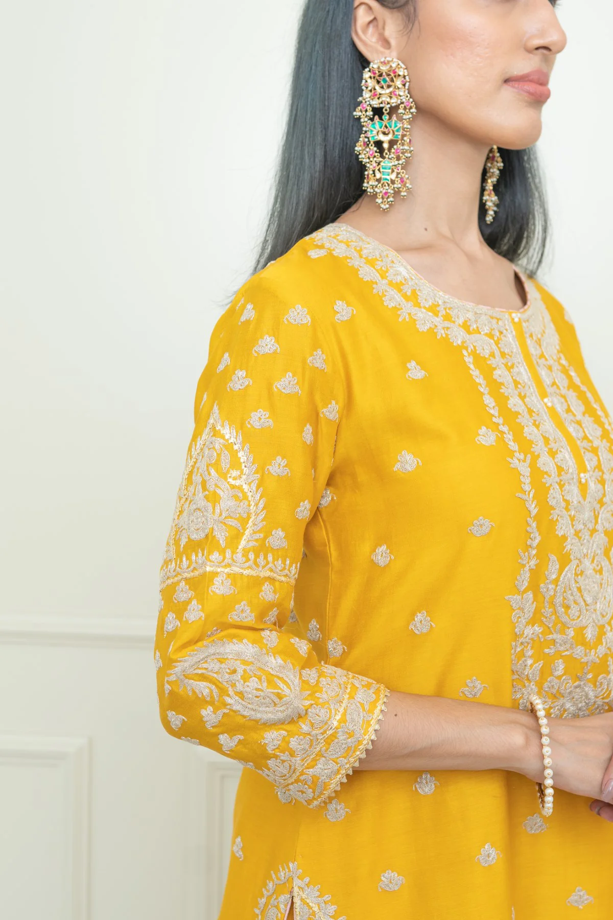 The Shaima ensemble is made in pure silk chanderi fabric and adorned with heritage Kashmiri Tilla Embroidery. It features a zero neck with placket and three-quarter sleeves. The whole ensemble is highlighted with gota and is finished using a rose pink chanderi silk banarsi fabric.