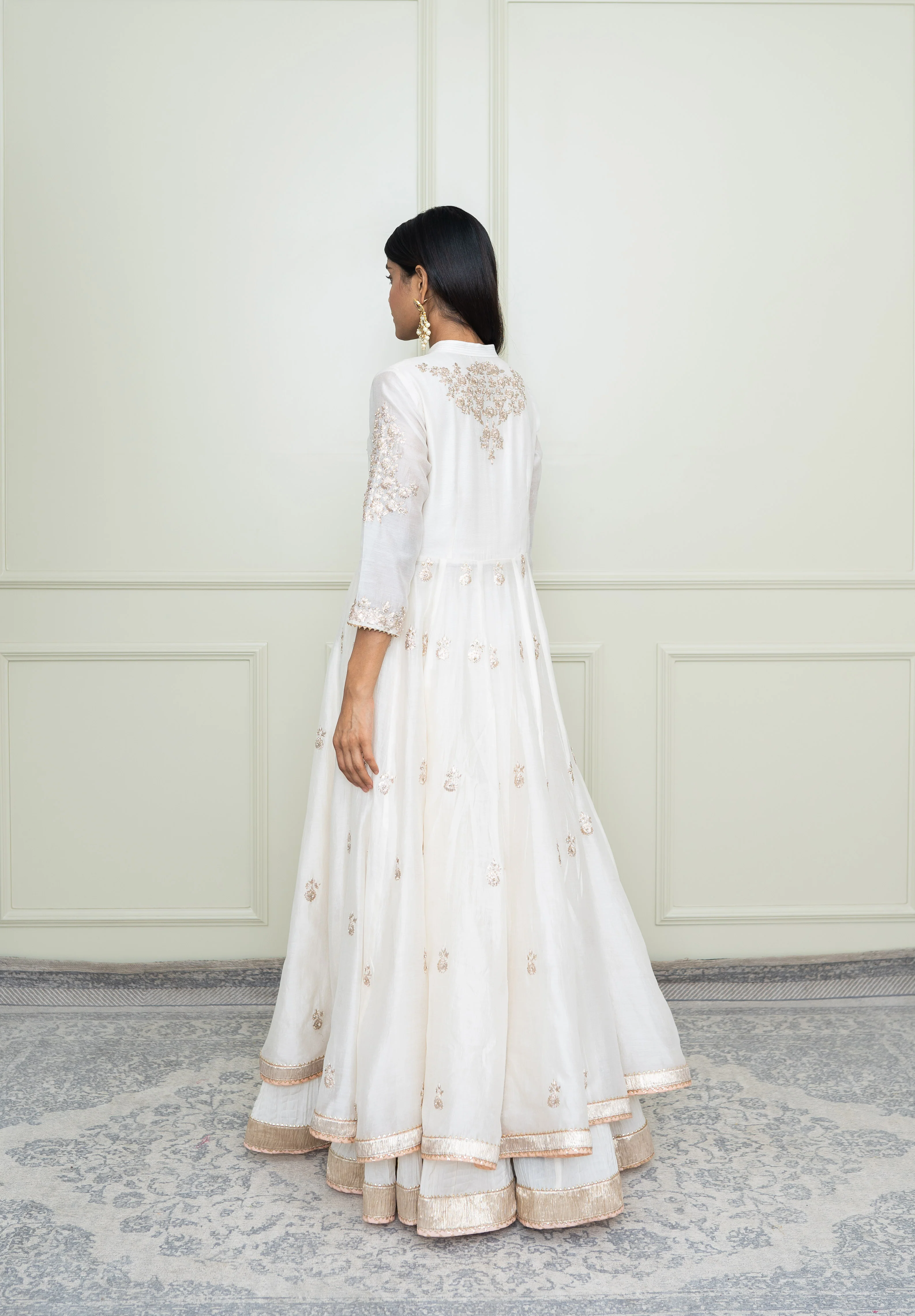 The Taveshi ensemble is features our signature Kashmiri Tilla embroidery. The elegant drape is accompanied by a zero neck with three-quarters sleeves. The ankle-length anarkali is teamed up with a crushed skirt. The yoke is highlighted with very fine pintucks. The embroidery is highlighted with very fine ivory pearls & the technique is an age-old tradition & one shall cherished it forever. The outfit is finished using a contrasting chanderi silk banarsi fabric and gota.